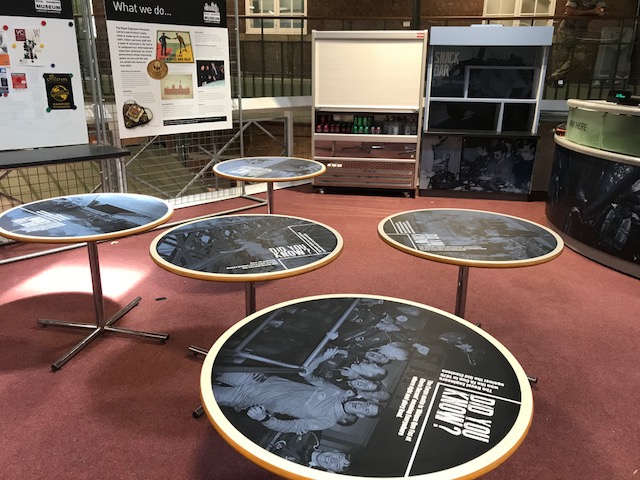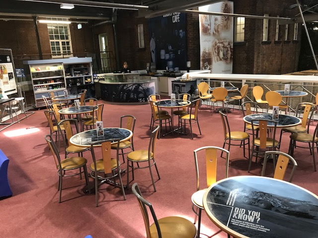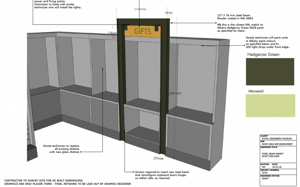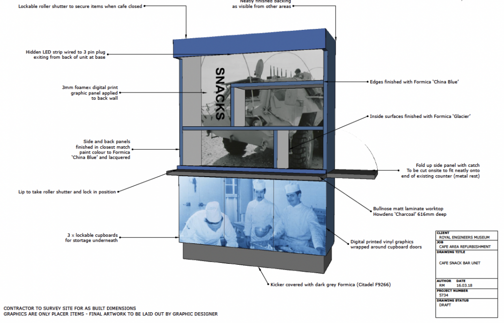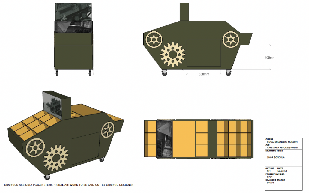 Design work for the Royal Engineers Museum in Gillingham. Refurbished shop and cafe areas, including mobile shop gondola with lockable castors, based on the military tractor in their collection.