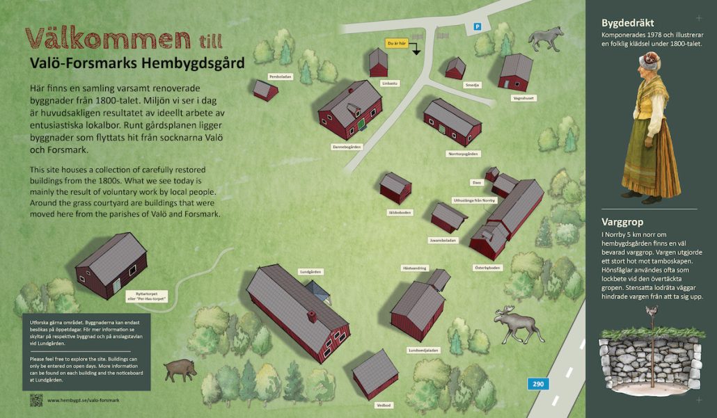 New welcome panel for Valo & Forsmark Museum in Sweden. Graphic design layout, illustration and printing management. I constructed the museum buildings in 3D using SketchUp then rendered the desired viewpoint and drew over the top using an Apple pencil and iPad, to give it a more sketched feel. The animals and wolf pit were hand drawn on paper then scanned and coloured up digitally.