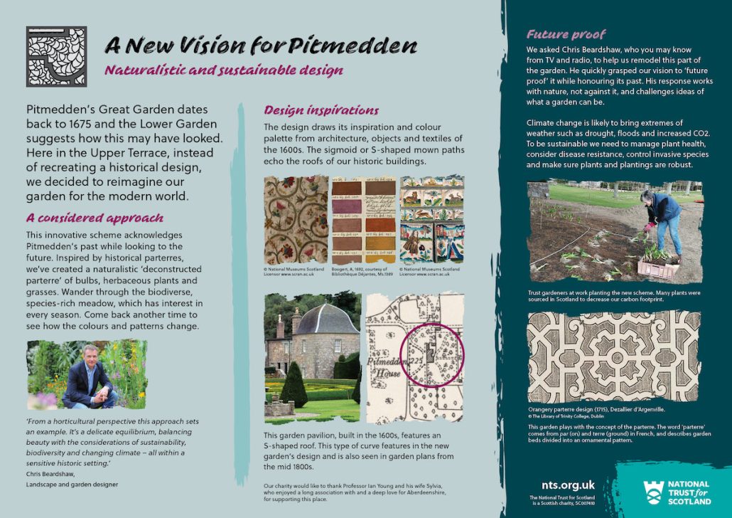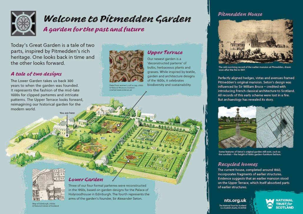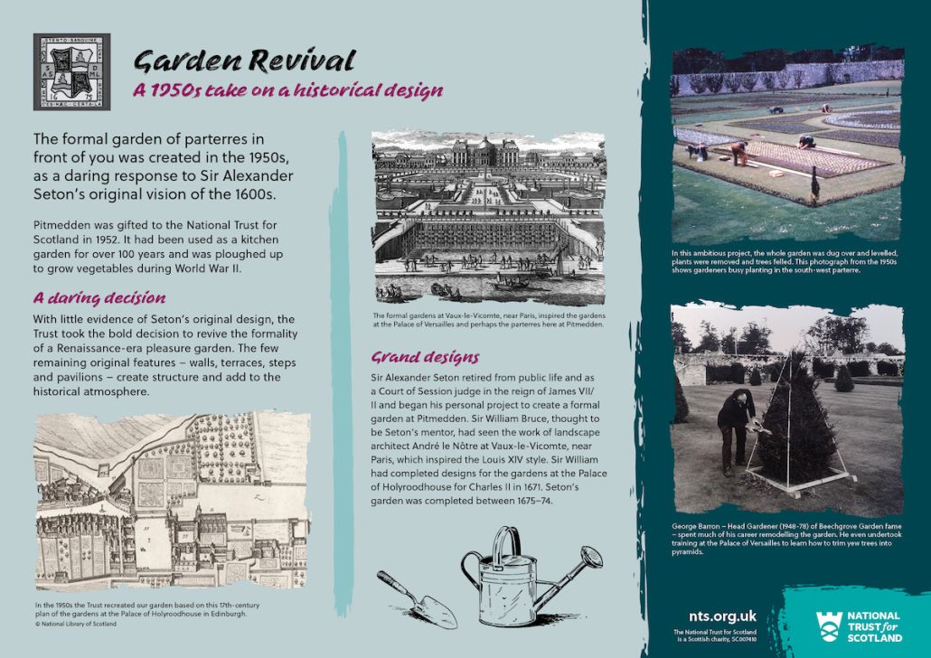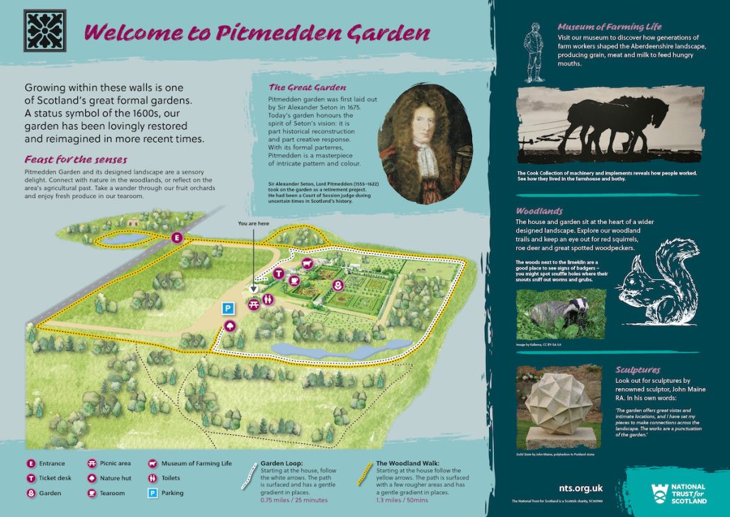 Pitmedden Garden New graphic panels for Pitmedden Garden, Aberdeenshire for the National Trust for Scotland. Graphic design layouts, watercolour illustration and printing and production management. Share: Twitter Facebook Google+